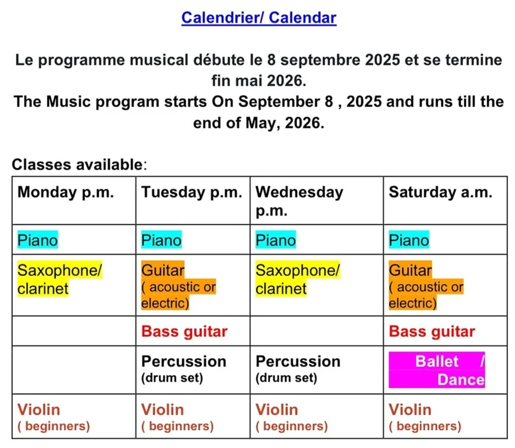 Students can choose to learn: la guitare, les percussions (batterie), le piano, le violon, le saxophone, le ballet et la danse amusante !